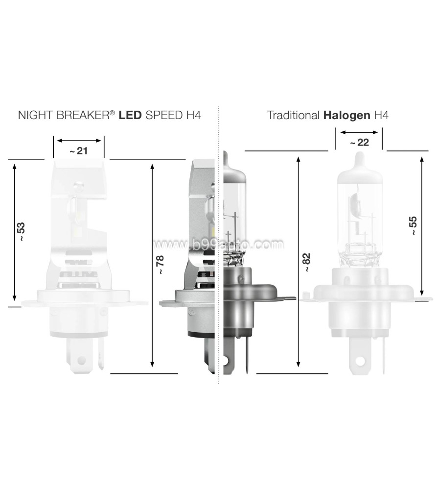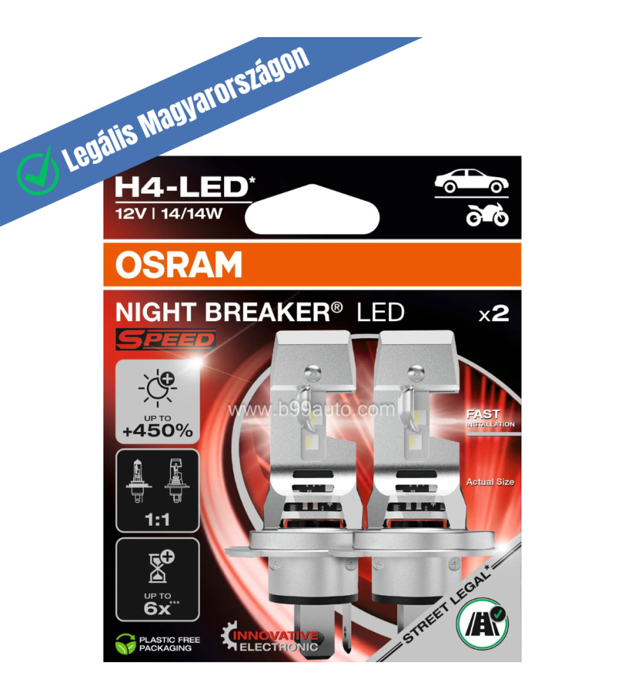 Az vadonatúj OSRAM NIGHT BREAKER LED SPEED H4 450%-os fényszórói forradalmian innovatív, utólag beépíthető LED-es fényszórólámpák, amelyek számtalan előnyt biztosítanak: legálisan használhatóak közúton, a Plug & Play megoldásnak köszönhetően gyorsan felszerelhetőek, kiemelkedő látási viszonyokat és láthatóságot garantálnak, és számos egyéb előnyős tulajdonság jellemzi őket. Az innovatív technológia akár 450 %-kal nagyobb fényerőt és akár 240 m-es megvilágítási távolságot tesz lehetővé. A maximum 6000 K-es hidegfehér fény pedig modern, korszerű megjelenést kölcsönöz a járműnek.
