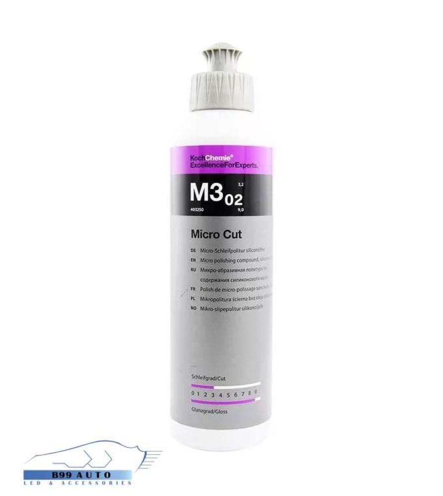 A Koch Chemie Micro Cut M3.02 a legújabb generációs professzionális polírozószer. A polírozószer alkalmas polírozási fátyol, hologramok, finom karcolások és csiszolási karcolások eltávolítására P3000-es szemcseméretig minden (beleértve a karcálló) festékrendszeren. A magasan specializált, rendkívül homogén csiszolókövek alkalmazásával ragyogó és tartós magasfényű fényezés jön létre még a sötét és hasonlóan érzékeny színárnyalatokon is, extrém fényviszonyok között. A hologramok és a finom karcolások mechanikusan eltávolításra kerülnek, és nem fedik el őket, mint ahogy az gyakran előfordul. A Micro Cut M3.02 rendkívül gazdaságosan használható és jól eltávolítható, anélkül, hogy polírozó vagy egyéb maradványokat hagyna maga után.