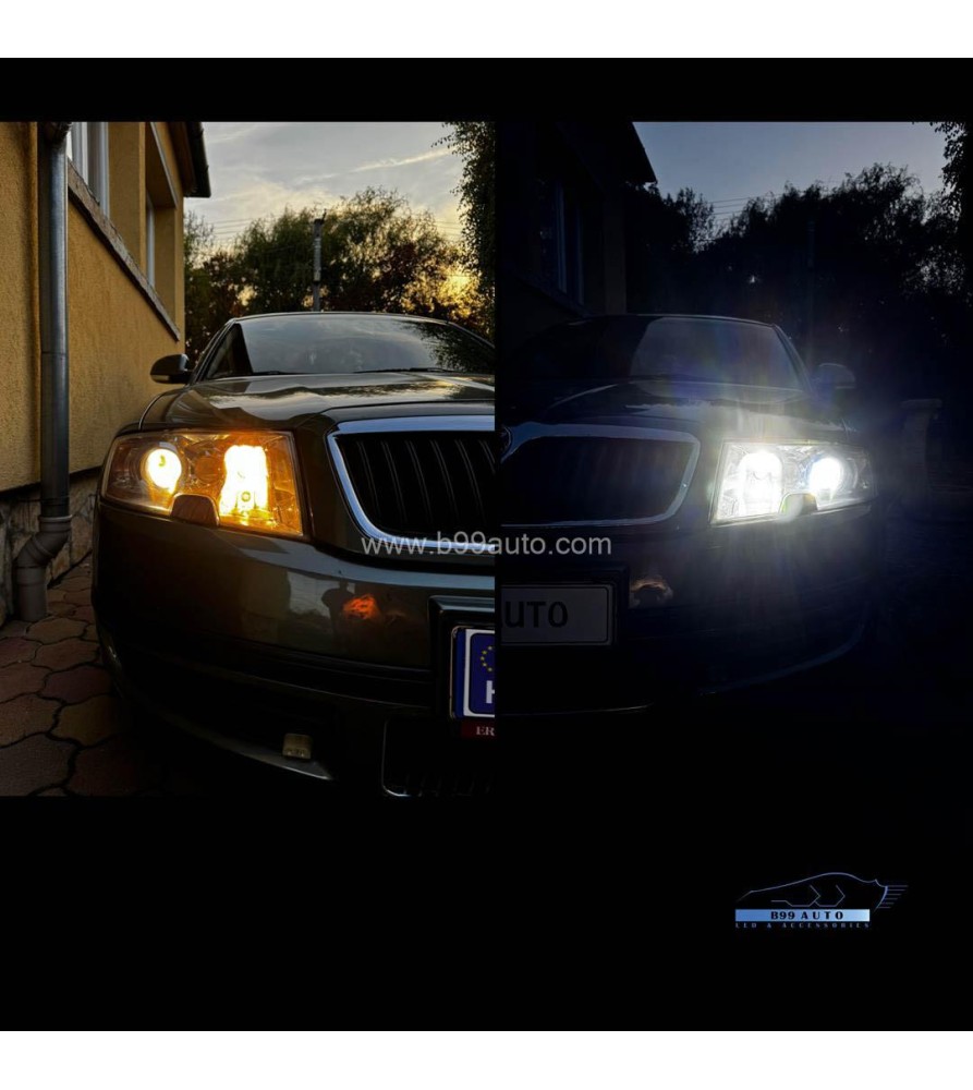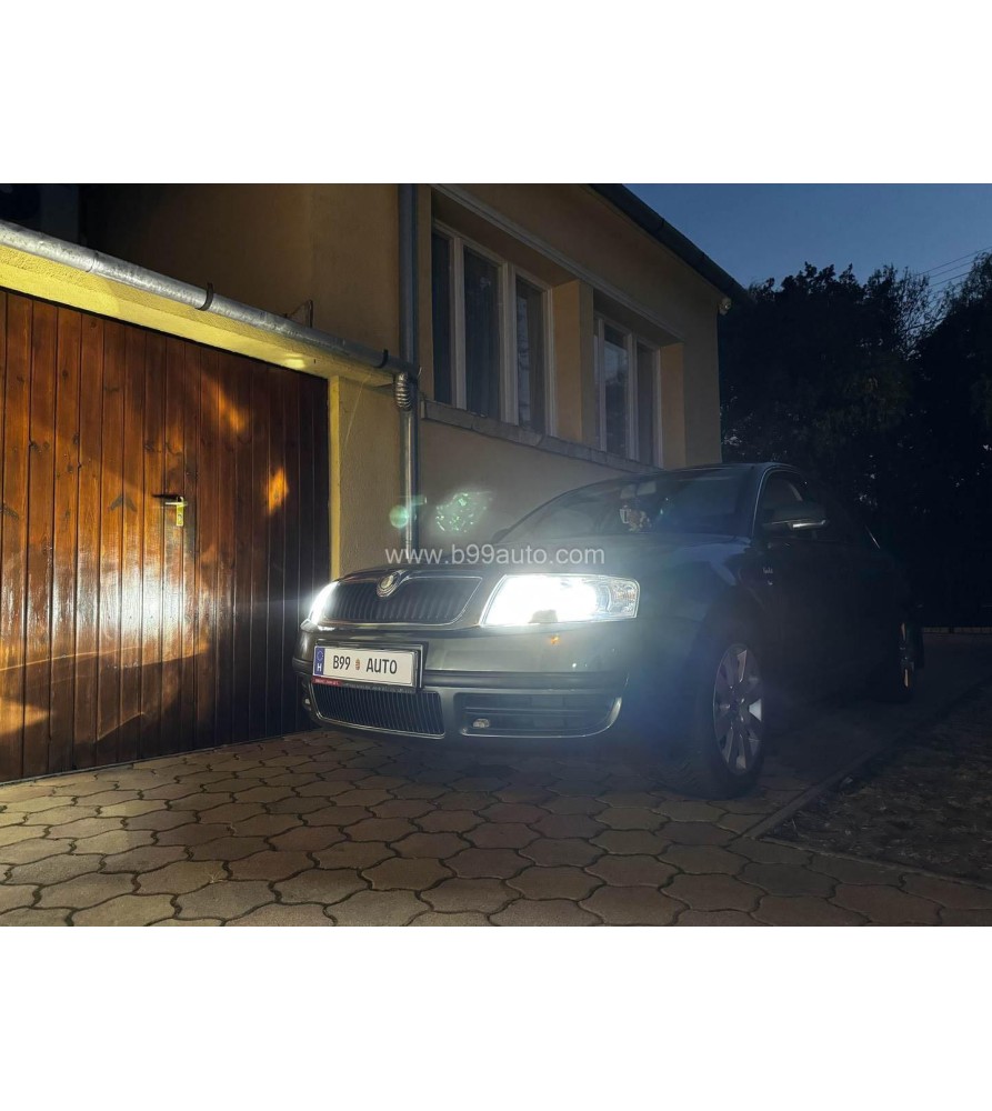 Skoda Superb első generációjának halogén fényszórós verziójához való, első lámpa LED szett. Tartalmazza a tompított és távolsági fényszóróval kompatibilis fényforrásokat, valamint a helyzetjelzőt izzók helyére passzoló LED-eket. H7/H3/W5W